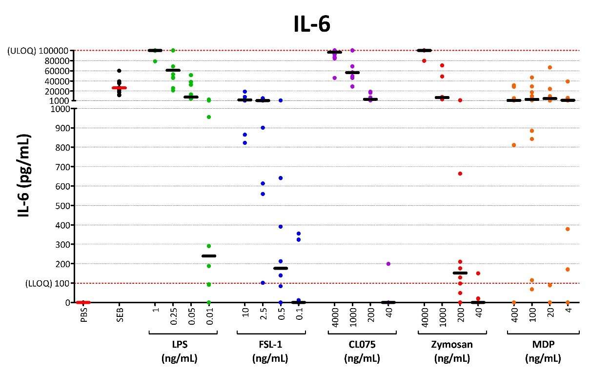 Figure 8. Cytokine Response Data for IL-6. Responses from a cohort of 29 donors, stimulated with (left to right) LPS, FSL-1, CL075, Zymosan, and MDP, at a range of concentrations. Medians are indicated by black lines.