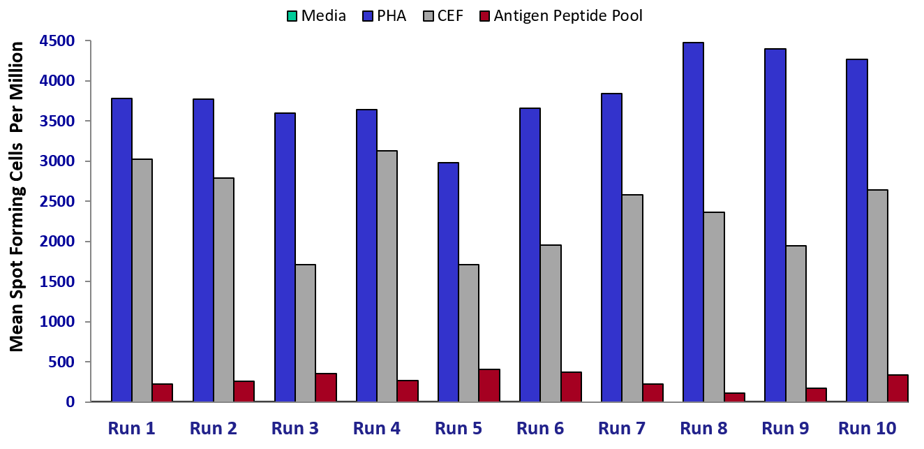 Figure 1. Data from IFN-γ ELISpot assays carried out by ProImmune. A donor with a positive antigen response was first identified and then used for each subsequent ELISpot analysis for the program as a performance control. Consistent responses were seen against the antigen, the ProMix CEF peptide pool and PHA across the 10 ELISpot runs, while the media-only negative control responses remained low.