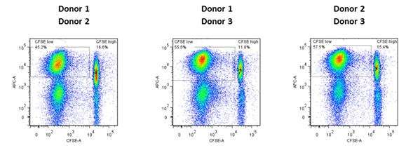 Figure 2. Flow cytometry plots showing gated live lymphocytes proliferating as a consequence of the MLR reaction. In each case monocyte derived dendritic cells (top row of figure title) were co-cultured with T cells from a mismatched donor (bottom row of title).