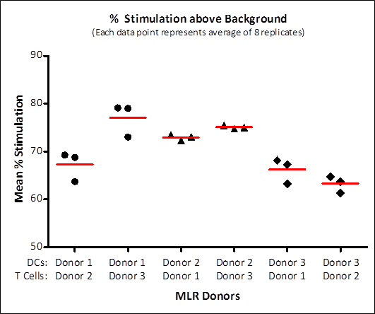 Figure 3. Assays were carried out in three repeat sets. The values for each set (represented by each dot) represents the average of 8 replicate wells each. MLR responses fell between 60-80% captured CD4+ T cells having undergone proliferation for all donors.